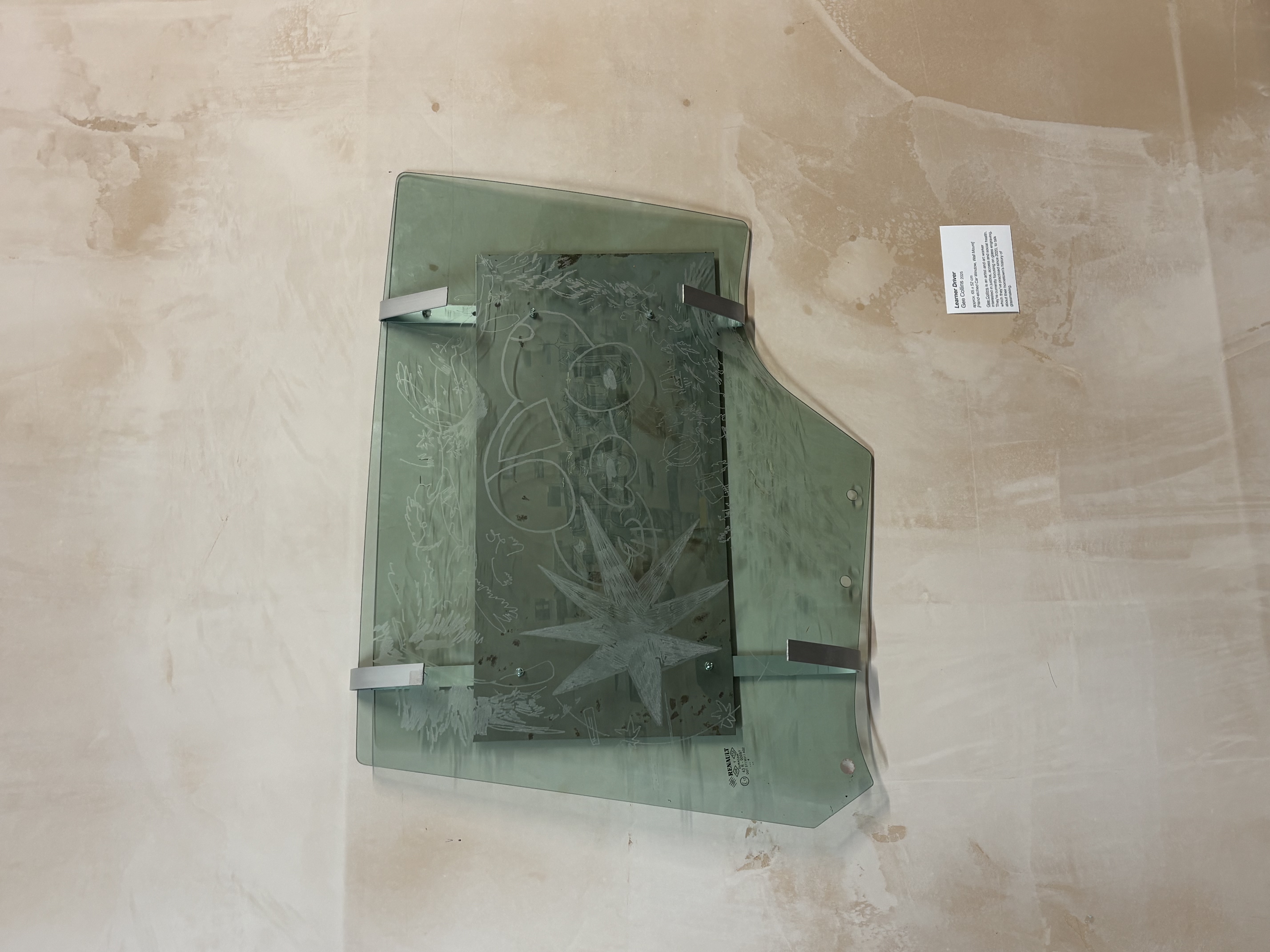 A hand engraved car window (about the 1996 film Crash and having to get public transport for two hours to go on bad Hinge dates in central Manchester).